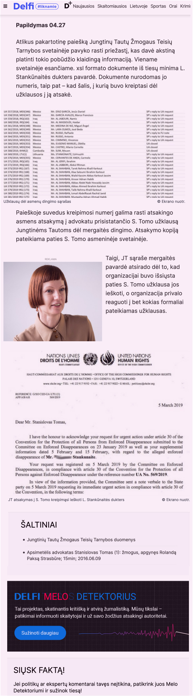 Balandžio 24 d. „Aktualus skambutis“ – LR Vyriausybės atstovo Europos Žmogaus Teisių Teisme (EŽTT) Karolinos Bubnytės-Širmenės komentaras apie nepriklausomo portalo delfi.lt paskelbtą informaciją dėl suklastoto Jungtinių Tautų (JT) dokumento apie paskelbtą tarptautinę Deimantės Kedytės paiešką.