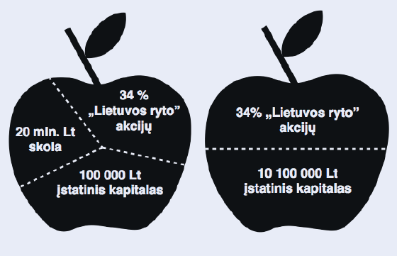 Kairėje matome į tris dalis padalintą obuolį. Tai UAB „Snoras Media“ balansas 2012 m. gruodžio 31 d., kai ši įmonė deklaravo turinti 110 894 Lt nuosavo kapitalo ir 20 016 274 Lt mokėtinų sumų bei įsipareigojimų. 20 000 000 Lt sudarė paskola iš AB „Snoras“ UAB „Lietuvos rytas“ 34 procentų akcijų paketui įsigyti. Jos grąžinimo terminas – 2014 m. gegužės mėnuo.