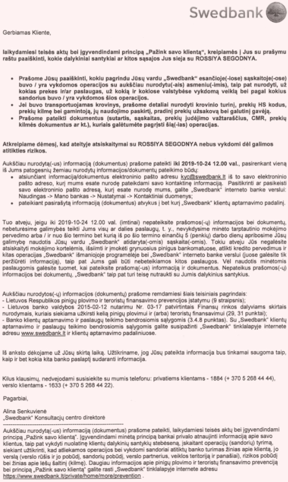Čia galite susipažinti su visu minėtu „Swedbank“ laiško turiniu, kuris skamba tikrai pakankamai grėsmingai: