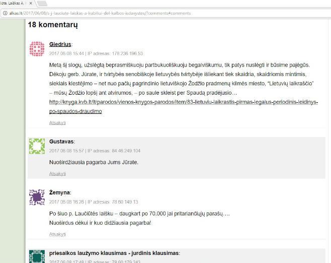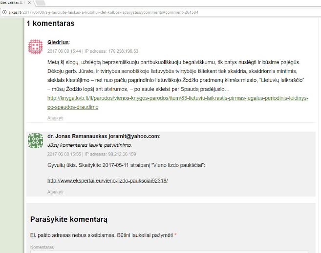 Perskaičiau alkas.lt puikų 2017-06-08 Jūratės Sofijos Laučiūtės straipsnį „S. J. Laučiūtė. Laiškas A. Kubiliui dėl kalbos išdavystės“. Palikau tokį komentarą (žiūrėkite paveikslėlį):