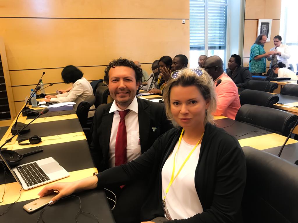 | Advokatas, profesorius Stanislovas Tomas ir jo padėjėja Ženevoje JTŽTK posėdžių salėje, 2018 07 09 |