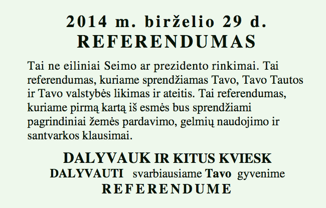 Aš tikiuosi, Kad Prezidentė, Seimas ir vyriausybė imsis neatidėliotinų priemonių pakeisti nežmoniškus Referendumo įstatymo straipsnius ir 2014 m. birželio 29 d. Referendumas nebus didžiuliu pasityčiojimu iš Lietuvos žmonių ir jų Suverenių galių.