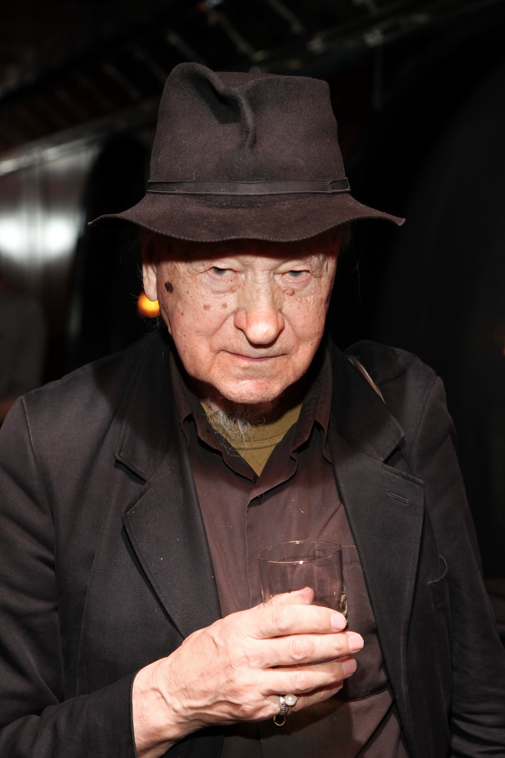 | „Jonas Mekas/Fluxus siena“ parodos atidaryme 2013 m. spalio 17 d. Briuselyje J. Meko pokalbis su prof. V. Landsbergiu. Nuotr. M. Mikulėno |