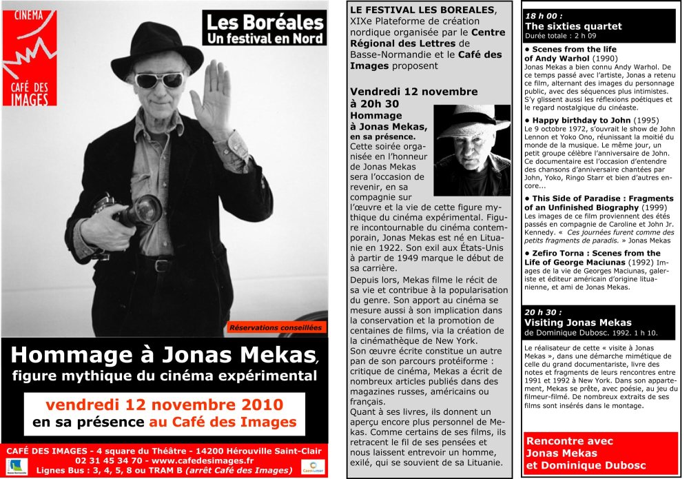 Kvietimas prancūzų kalba 2010 m. lapkričio 12 d. skelbia apie susitikimą su eksperimentinio kino „mitine figūra“ J. Meku atokiame šiaurės vakarų Prancūzijos miestelyje su 22 tūkst. gyventojų Heruvil Sen Klere (Hérouville-Saint-Clair).
