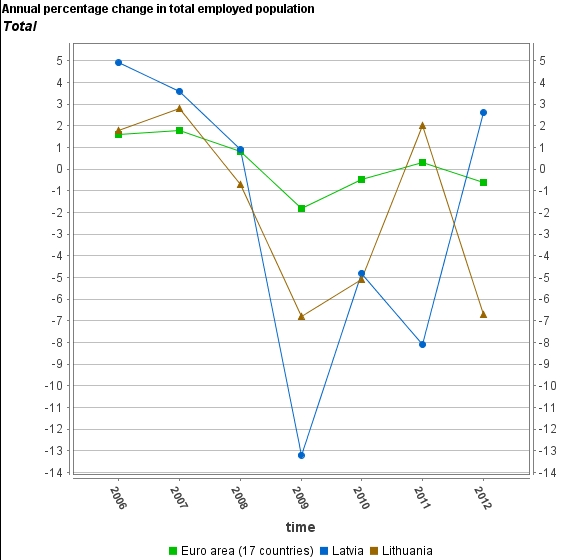 (Grafike pavaizduota, kaip nuo 2006 iki 2012 metų gyventojų populiacijoje keitėsi dirbančiųjų skaičius (procentais); Latvijos laužtė mėlyna, Lietuvos – šviesiai ruda, žalia – 17 eurozonos valstybių, – red. past.)