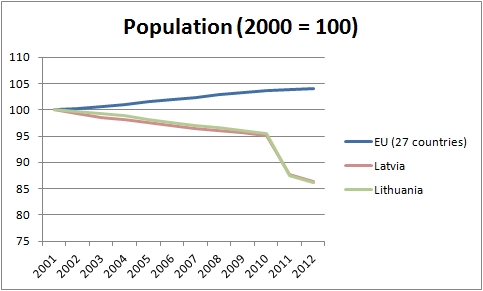 Kita vertinimo alternatyva – pažvelgti į bendro gyventojų skaičiaus pokytį. Per pastarąjį dešimtmetį Lietuvą ir Latviją ištiko demografinė griūtis. Eurostato duomenimis, gyventojų skaičius Lietuvoje 2007-2012 m. laikotarpiu sumažėjo 377 000 žmonių (11,1 %), Latvijoje – 240 000 (10,5 %).