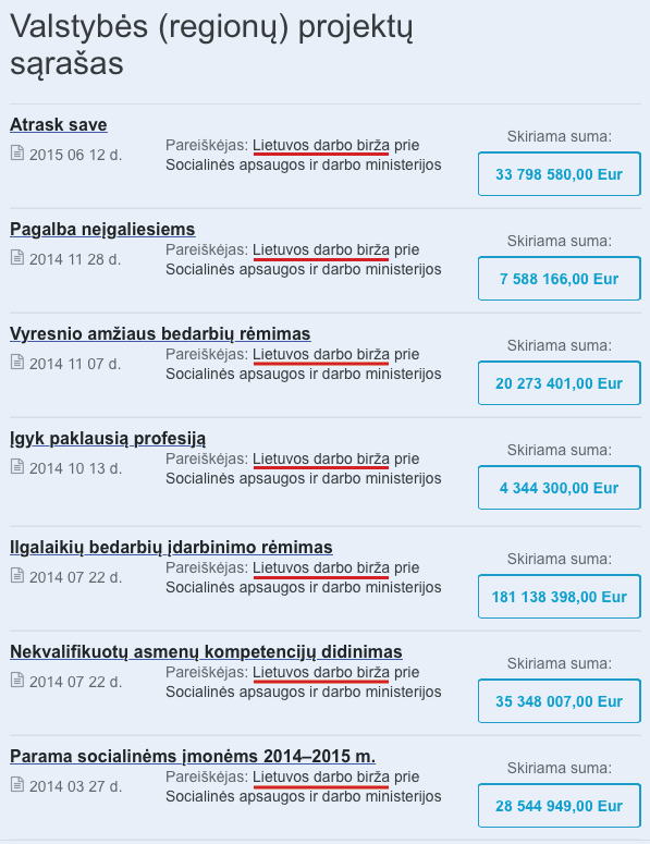 Jūsų dėmesiui kelių projektų sąrašėlis, kuris, padedant Darbo biržai, sudaro galimybę padaryti daugiau atradimų ieškant savęs ir integruotis į darbo rinką. Šiam tikslui skirta 310 milijonų 999 tūkstančiai 801 euras (1 milijardas 73 milijonai litų)