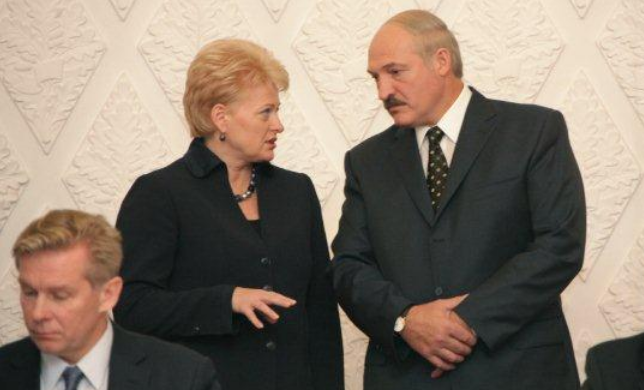 | Prezidentė Dalia Grybauskaitė susitikime 2010 m. rudenį Minske su paskutiniuoju Europos diktatoriumi Aleksandru Lukašenka. Kairėje matosi Žmonių partijos atstovo, tuometinio Lietuvos užsienio reikalų ministro Audroniaus Ažubalio galvutė. Nuotr. prezidentas.lt |