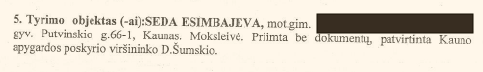 Iš dokumento matyti, kad S. Esimbajeva, kuriai tuo metu buvo beveik dvidešimt metų, atvykusi į Teismo medicinos instituto Kauno skyriaus ambulatoriją nepateikė jokių asmens dokumentų, o jos tapatybę patvirtino ne kas kitas, o VSD Kauno apygardos poskyrio viršininkas D. Šumskis.