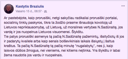 „Ar pastebėjote, kaip prorusiški, netgi sakyčiau radikaliai prorusiški portalai, socialinių tinklų paskyros, tikra ta žodžio prasme išnaudoja kovotoją už Lietuvos nepriklausomybę, už Lietuvą, už moralines vertybes N.Sadūnaitę, jos vardą ir jos nuopelnus Lietuvos visuomenei. Šlykštu.