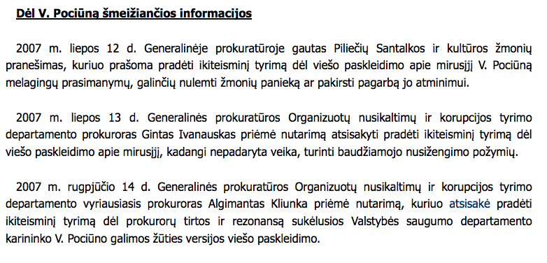 Prokuroras Gintas Ivanauskas, kuriam patikėta tirti bylą dėl VSD įslaptintos informacijos apie Rusijos rengiamas informacines atakas nutekinimo žiniasklaidai, prieš šešerius metus priėmė sprendimą, palankų Baltarusijoje žuvusį pulkininką Vytautą Pociūną po mirties dergusiems VSD pareigūnams ir „Lietuvos ryto“ žurnalistams.