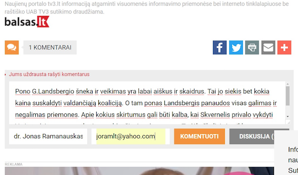 To įrodymui pateikiu internetinio puslapio paveikslėlį, kuriame aiškiai ir nedviprasmiškai parašyta: „Jums uždrausta rašyti komentarus“. Tai reiškia, kad nepriklausomai nuo komentaro turinio yra uždrausta rašyti komentarus. Tai kartu įrodo, kad mano veikla siekiant atkūrti Lietuvoje konstitucinę santvarką yra labai gerai pastebėta ir įvertinta cenzūros įvedimu. Toji cenzūra pasireiškia ne vien tuo, kad kažkoks portalas save išsikėlė aukščiau LR Konstitucijos, o tai pagrindinai pasireiškia tuo, kad patys Seimo nariai, kurie prisiekė LR Konstitucijai ją niekina ignoravimu ir tai reiškia, kad Seimo nariai, Vyriausybės, Prezidentai išsikėlė save aukščiau Konstitucijos ir paniekino atkuriamą Lietuvos valstybę. Tą daro ir signatarai, bei Lietuvos strategas ir pirmasis jos vadovas prof. Vytautas Landsbergis. Kur toliau?
