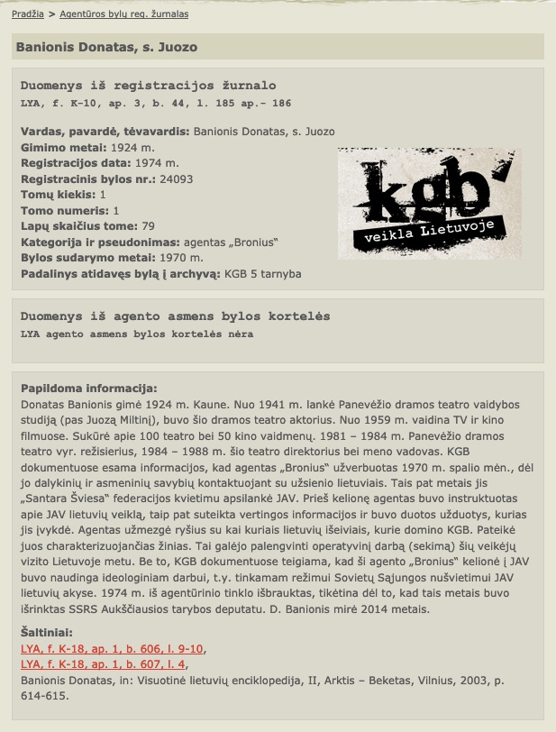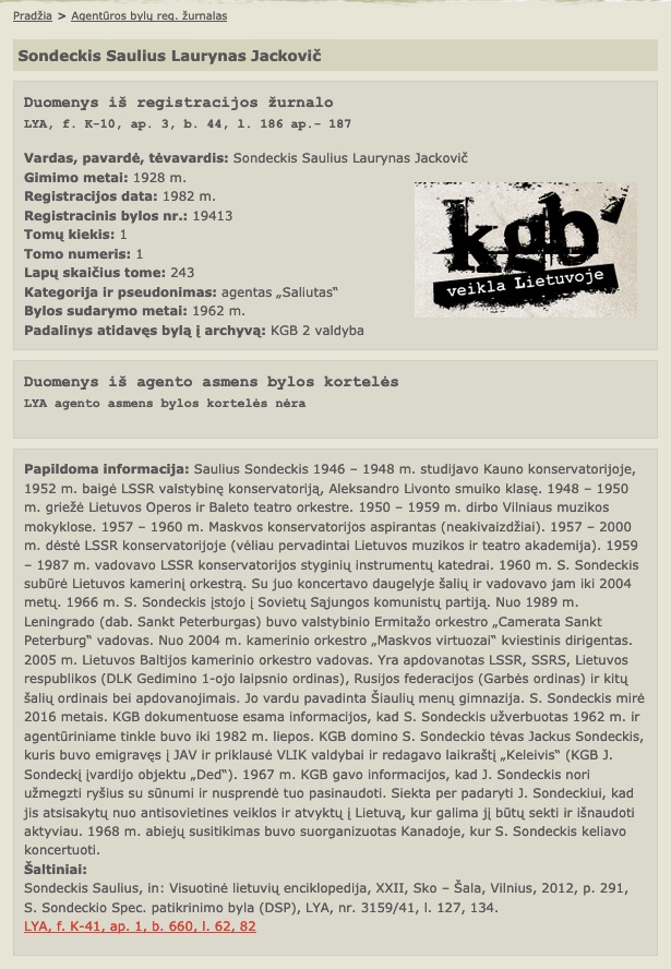 „2018 m. sausio 5 d. Lietuvoje buvo sukeltas viešas skandalas, Lietuvos gyventojų genocido ir rezistencijos tyrimo centro (LGGRTC) interneto svetainėje www.kgbveikla.lt paskelbus LGGRTC sukurtus dokumentus, kad a.a. kardinolas Vincentas Sladkevičius yra KGB agentas „Alksnis“, a.a. Donatas Banionis – KGB agentas „Bronius“, a.a. Saulius Sondeckis - KGB agentas „Saliutas“.