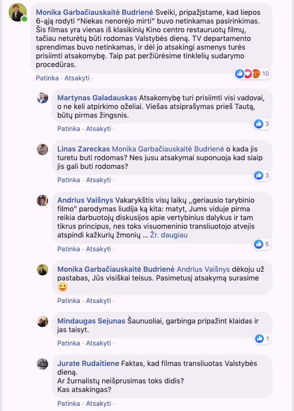 „Pripažįstame, kad liepos 6-ąją rodyti „Niekas nenorėjo mirti“ buvo netinkamas pasirinkimas. Šis filmas yra vienas iš klasikinių Kino centro restauruotų filmų, tačiau neturėtų būti rodomas Valstybės dieną. TV departamento sprendimas buvo netinkamas, ir dėl jo atsakingi asmenys turės prisiimti atsakomybę. Taip pat peržiūrėsime tinklelių sudarymo procedūras“, - visuomeniniuose tinkluose patikino Gebelsčiauskaitė.