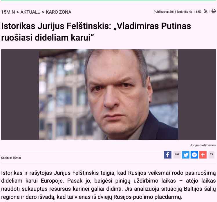 Dar anksčiau – 2014 metų rudenį populiarus Lietuvoje, rusų-amerikiečių istorikas ir rašytojas Jurijus Felštinskis, gyvenantis Jungtinėse Valstijose, tąkart pranešė, kad Rusijos veiksmai rodo pasiruošimą dideliam karui Europoje. Apie tai yra informavęs portalas 15min.lt.