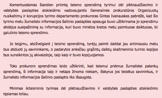 Toks prokuroro G. Ivanausko paaiškinimas leidžia suprasti, kad gauta informacija niekaip nedarė įtakos Generalinės prokuratūros pozicijai, kai buvo skelbiama, jog yra žinoma, kas nutekino informaciją.