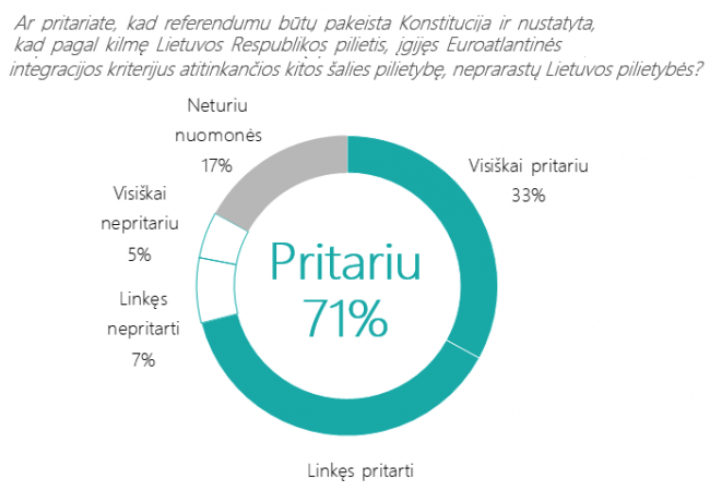 „Tyrimo rezultatai rodo, kad dauguma (71 proc.) tyrimo dalyvių pritaria nuostatai, kad Lietuvos Respublikos Konstitucija būtų keičiama referendumu ir joje būtų nustatyta, kad pagal kilmę Lietuvos Respublikos pilietis, įgijęs euroatlantinės integracijos kriterijus atitinkančios kitos šalies pilietybę, neprarastų Lietuvos pilietybės - tam visiškai pritaria 33 proc. ir linkę pritarti 38 proc. apklaustųjų. Priešingą nuomonę išreiškė 12 proc. gyventojų: 5 proc. nepritaria visiškai, 7 proc. yra linkę nepritarti“, - sklebiama ministerijos pranešime „Atliktas šalies gyventojų nuomonės tyrimas dėl LR pilietybės išsaugojimo“.