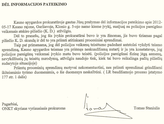 Generalinio prokuroro pavaduotojas įsipareigojo padaryti net du dalykus: sužinoti, ar prokurorai žinojo apie šį epizodą (juk sadistinių polinkių neturinčiam žmogui labai sunku patikėti, kad matant tokį žiaurumą prieš beginklį žmogų buvo galima nepradėti tyrimo dėl smurto); o jei prokurorai šią medžiagą vis dėlto matė, jis pažadėjo asmeniškai paaiškinti, kuo remiantis tokie pareigūno veiksmai laikomi teisėtais (apie tai rašėme publikacijoje „D. Raulušaitis išsiaiškins, ar pareigūnas turėjo teisę šautuvo buože daužyti gulinčiam vyrui į tarpkojį”).