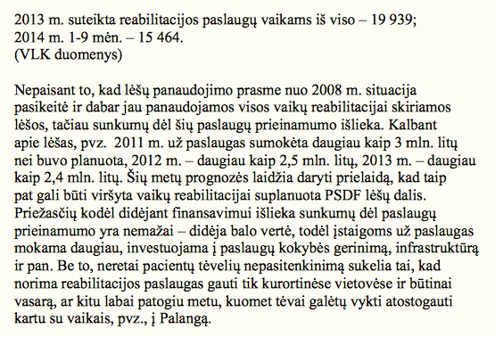 Š. m. rugsėjo 18 d. kalbėdama radijo stotyje „Laisvoji banga“, Sveikatos apsaugos ministrė Rimantė Šalaševičiūtė patvirtino skandalingą faktą, kad Lietuvos vaikų reabilitacijai kasmet nepanaudojami apie du, trys milijonai litų.