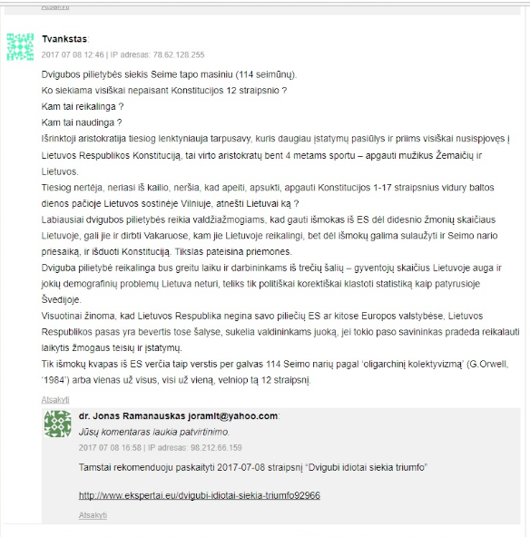 Perskaitau aukščiau pateiktame paveiksle padorią komentatoriaus „Diedas“ nuomonę ir matau, kad jam už „skvernų“ griebia dr. Jonas Vaiškūnas taip: „Kiek galima plakti nesuplakamas tautybę ir pilietybę?“. Dar kartą atidžiai perskaitau komentatoriaus „Diedas“ komentarą. Joko plakimo, suplakimo ar nesuplakimo tame komentare visiškai nėra. Komentatorius aiškiai išdėstė nuomonę, kad „kiekvienas tautietis privalo turėti Lietuvos pilietybę“. Matomai tokia komentatoriaus nuomonė ir įsiutina dr. Joną Vaiškūną, nes griebia už „skvernų“ ginčytis kažkokiu idiotišku pagrindu, kad kažkas kažkur plaką nesuplakamas tautybę ir pilietybę.