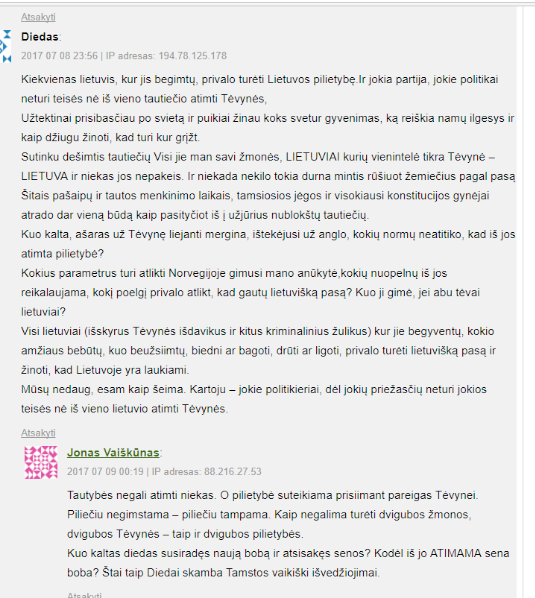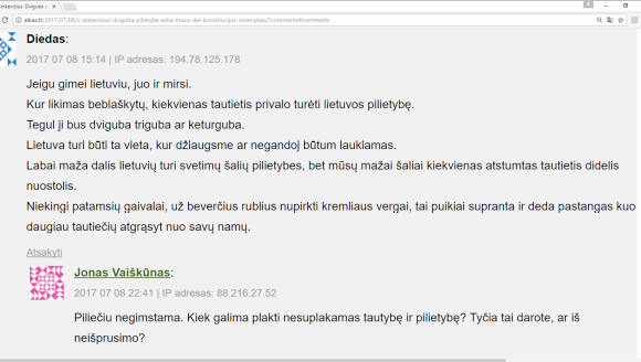 Po to matau kitą komentatoriaus „Diedas“ komentarą, kuris jis išdėsto savo poziciją „Visi lietuviai (išskyrus Tėvynės išdavikus ir kitus kriminalinius žulikus) kur jie begyventų, kokio amžiaus bebūtų, kuo beužsiimtų, biedni ar bagoti, drūti ar ligoti, privalo turėti lietuvišką pasą ir žinoti, kad Lietuvoje yra laukiami.”. Nedelsiant, po 23 sekundžių, pasirodo jau parašytas ir atspausdintas dr. Jono Vaiškūno komentaras, kuriame teigiama: „Tautybės niekas negali atimti“. Ko gero ponas J.Vaiškūnas nežino Rytų Lietuvos okupacijos istorijos, kai už maišą grūdų, kad išgyventum, lietuviai turėjo užsirašyti lenkais. Todėl dr. Jono Vaiškūno teiginys atrodo, kaip neišmanėlio teiginys.