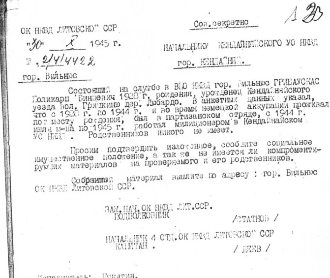 Todėl ekspertai.eu kreipiasi į Lietuvos gyventojų genocido ir rezistencijos tyrimų centrą, prašydami pakomentuoti dokumentus, kurių fragmentai čia pateikti, ir atsakyti į du klausimus: ar tiesa, kad Lietuvos ypatingajame archyve saugoma Polikarpo Grybausko (Lietuvos prezidentės D. Grybauskaitės tėvo) asmens byla rodo, jog nuo 1944 m. liepos iki 1945 m. jis dirbo Kėdainių apskrities NKVD milicininku ir turėjo teisę nešioti „vintovką” Nr. 1439? Kokia minimu laikotarpiu buvo NKVD milicininkų tarnyba, ką jie veikdavo?