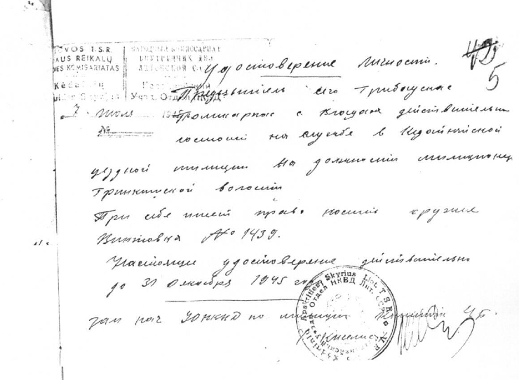 Štai šiame NKVD išduotame asmens tapatybės pažymėjime parašyta, kad P. Grybauskas „tikrai tarnauja Kėdainių apskrities milicijoje milicininko pareigose” (v Kedainiaiskoj ujezdnoj milicii na dolžnosti milicionera), „turi teisę nešioti vintovką Nr. 1439” (pri sebe imeet pravo nosit oružije vintovka Nr. 1439), o pats pažymėjimas galioja iki 1945 m. spalio 31 d.: