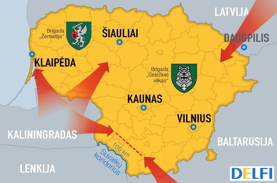| Delfi.lt analitikų pateiktame žemėlapyje aiškiai matosi, iš kurių pusių NATO ir ES šalį Lietuvą puls Rusija. |