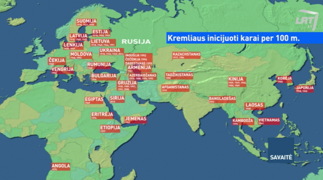 Valstybinis transliuotojas taip pat paviešino žemėlapį, kuriame beveik tiksliai nurodyta, kur pasaulyje Kremlius inicijavo karus per pastaruosius 100 metų. Žemėlapyje tik įsivėlė klaida, ir nenurodyta Vokietija, kurios didelę teritorijos dalį kaip ir sostinės Berlyno, Tarybų Sąjunga buvo atplėšusi ir okupavusi po Antrojo pasaulinio karo.