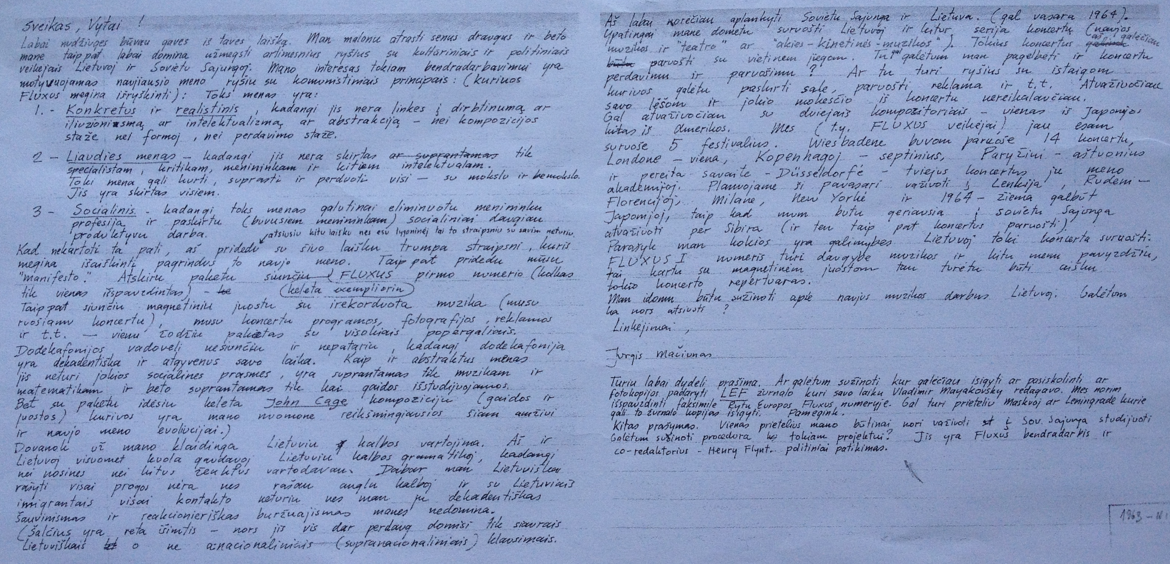 Rasa Gečaitė: Gal Jūs galite patikslinti keletą dalykų, kurie yra susiję su Jūsų ir J. Mačiūno „fluxus“ ryšiais? Ar buvo kur nors skelbtas Jūsų pirmasis laiškas J. Mačiūnui, kurio atsakymą (1963 04 01) į Jūsų laišką esate paskelbęs? Ar galima būtų gauti jūsų pirmojo ir antrojo laiško Jurgiui Mačiūnui faksimiles?