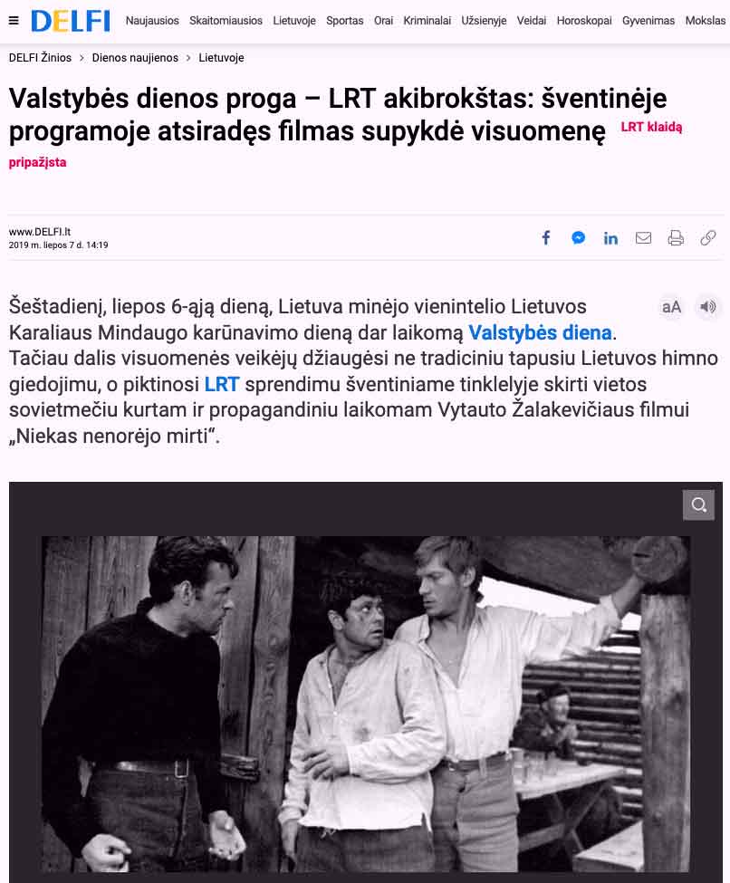 „Pripažįstame, kad liepos 6-ąją rodyti „Niekas nenorėjo mirti“ buvo netinkamas pasirinkimas. Šis filmas yra vienas iš klasikinių Kino centro restauruotų filmų, tačiau neturėtų būti rodomas Valstybės dieną. TV departamento sprendimas buvo netinkamas, ir dėl jo atsakingi asmenys turės prisiimti atsakomybę. Taip pat peržiūrėsime televizijos programų tinklelių sudarymo procedūras“, - pasistengė nuraminti propagandistą valstybinio transliuotojo klapčiukas.