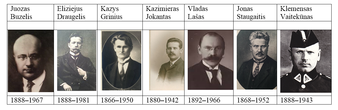 Nuotrauka 3 Steigiamojo Seimo nariai kariškiai, atstovavę įvairioms parlamentinėms frakcijoms. Iš kairės sėdi: Petras Ruseckas, Feliksas Mikšys, Jonas Galvydis-Bykauskas, Konstantinas Žukas. Stovi: Ladas Natkevičius, Klemensas Vaitekūnas, Vincas Šmulkštys, Antanas Matulaitis (žuvo kovų metu). Atspindžiai, 1920, Nr. 1, p. 2. |