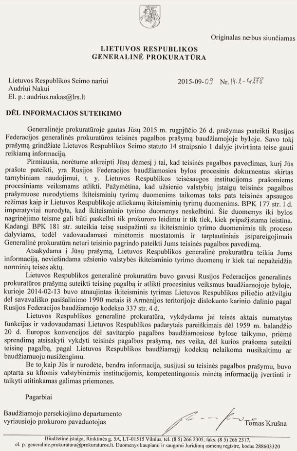 „2015 m. rugsėjo 9 d. Generalinės prokuratūros raštu Nr.14.24278 atsakėte į Seimo nario A. Nako 2015 m. rugpjūčio 26 d. paklausimą dėl informacijos pateikimo apie Rusijos Federacijos Generalinės prokuratūros prašymą Lietuvos Respublikos Generalinei prokuratūrai dėl teisinės pagalbos suteikimo baudžiamojoje byloje, kuri buvo atnaujinta 2014 m. vasario 13 d. Lietuvos Respublikos piliečio atžvilgiu dėl jo savavališko pasitraukimo iš Tarybinės armijos karinio dalinio Armėnijoje 1990 m.
