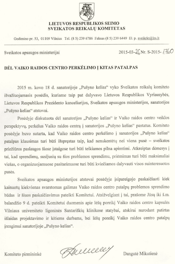 Tačiau kovo 26 d. Seimo Sveikatos reikalų komiteto raštas Sveikatos ministerijai kelia nuostabą. Iš siūlytų trijų variantų staiga liko tik du. Netikėtai ėmė ir išnyko adresas Vytauto g. 15, Žvėryne: