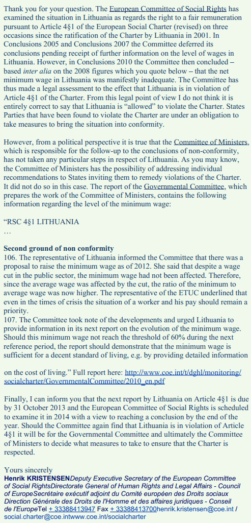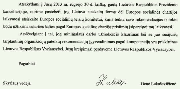 Ekspertai.eu pateikė klausimą Seimo vicepirmininkui Algirdui Sysui, Respublikos prezidentei ir Europos socialinių teisių komiteto (ESTK) vykdomojo sekretoriaus pavaduotojui Henrikui Kristensenui: kodėl Lietuvai leidžiama pažeidinėti Chartiją?