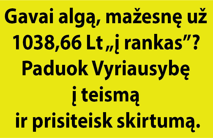 Gavai algą, mažesnę už 1038,66 Lt „į rankas“? Paduok Vyriausybę į teismą ir prisiteisk skirtumą.