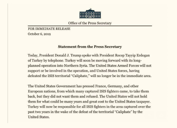 Po JAV ir Turkijos Prezidentų telefoninio pokalbio JAV Prezidento spaudos tarnyba praneša, kad JAV kariuomenė traukiasi iš Sirijos - Turkijos pasienio, nes „Islamo valstybės“ kalifatas įveiktas.