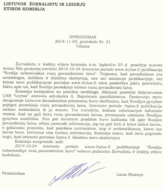 Komisija apsvarsčiusi šį skundą nusprendė, kad publikacija „Švedija nebesivaikys rusų povandeninio laivo“ nebuvo pažeistas Žurnalistų ir leidėjų etikos kodeksas.