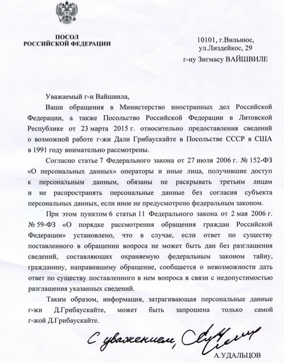Gautas Rusijos Federacijos URM ir ambasados Lietuvoje atsakymas nustebino – atsisakė pateikti man prašomą informaciją, motyvuojant tuo, kad Rusijos Federacijos federaliniai įstatymai draudžia ją pateikti be Dalios Grybauskaitės sutikimo, o be to, ši informacija tebėra Rusijos Federacijos valstybės paslaptis.
