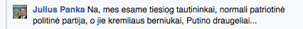 Komentaruose prie savo pranešimo J. Panka teigė: „Mes esame tiesiog tautininkai, normali patriotinė politinė partija, o jie kremliaus berniukai, Putino draugeliai…“.