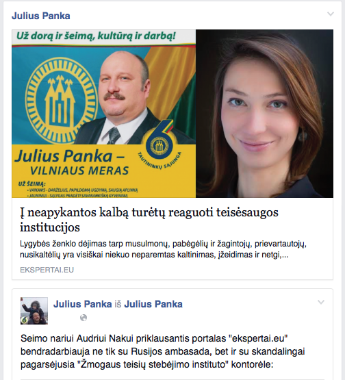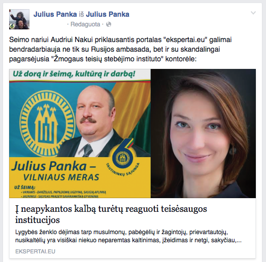 Politinės partijos „Tautininkų sąjunga“ lyderis Julius Panka socialiniame tinkle facebook išplatino pranešimą, kuriame nurodė ekspertai.eu ir Rusijos ambasados sąsajas.