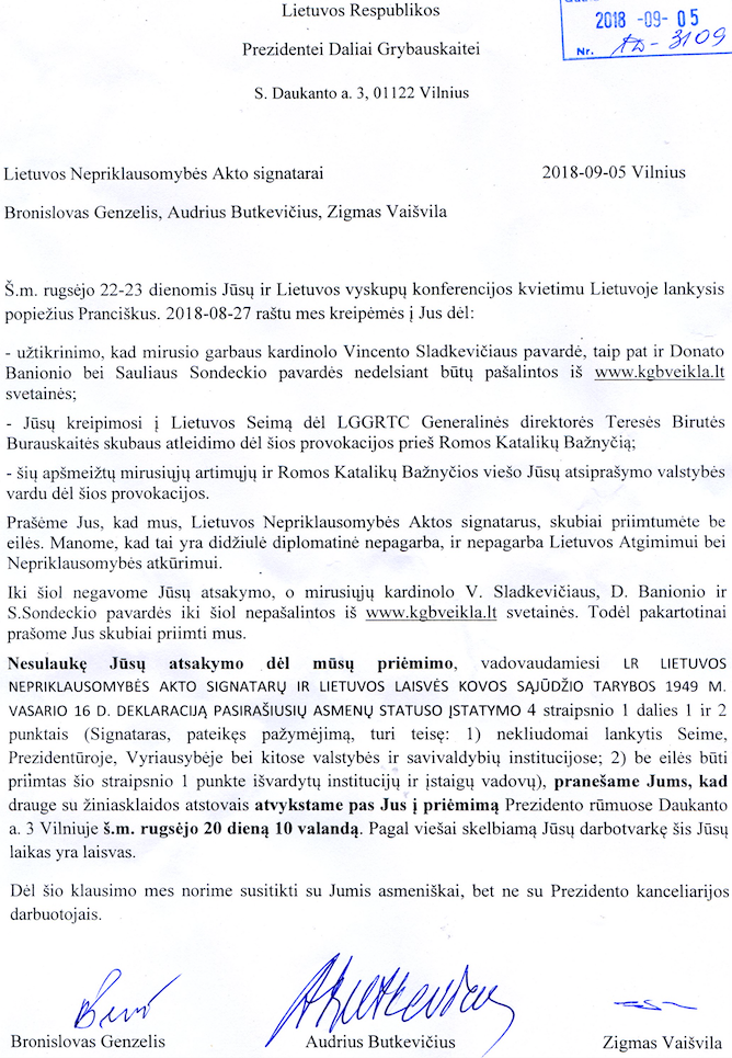 2018 m. rugsėjo 5 d. 12.30 val. įvyko Lietuvos Nepriklausomybės Akto signatarų Bronislovo Genzelio, Audriaus Butkevičiaus ir Zigmo Vaišvilos spaudos konferencija Seime „Ką Lietuva nori pasakyti Popiežiui su KGB korta?“