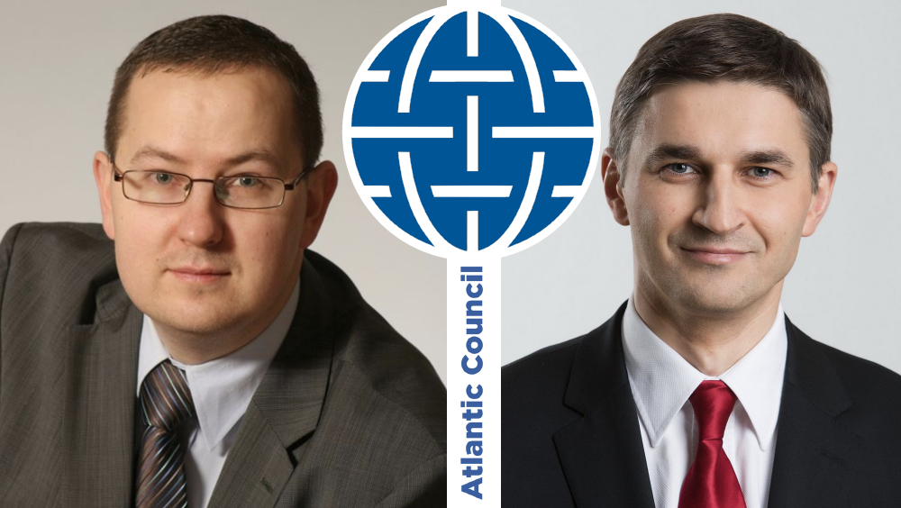 | Lietuvos radijo ir televizijos komisijos vadovas Mantas Martišius (kairėje) ir buvęs Lietuvos Respublikos energetikos ministras Jaroslav Neverovič. Viduryje – Atlantic Council logotipas. |