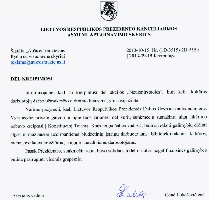 O čia atsakymas kultūros darbuotojams iš Lietuvos Respublikos Prezidentūros, kurį vietoj prezidentės 2013 10 15 pasirašė LR prezidento kanceliarijos Asmenų aptarnavimo skyriaus vedėja Genė Lukaševičienė.