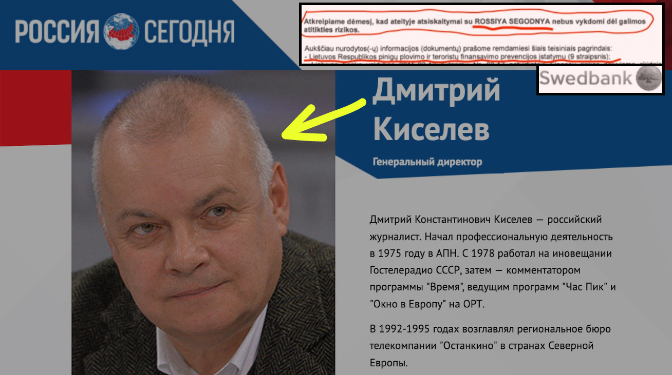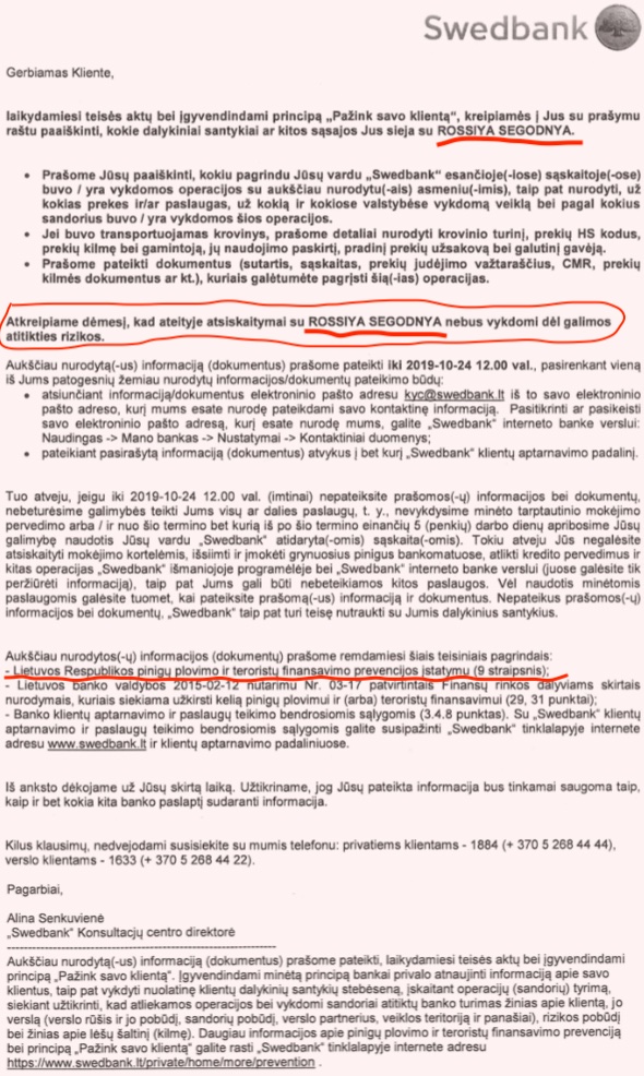 „Peržiūrėję tiek jūsų, tiek ir ir Lietuvos banko siųstas nuorodas neradome, kurioje vietoje yra įrašyta tarptautinė media kompanija „ROSSIYA SEGODNYA“. Pagal mūsų turimą SWEDBANK dokumentą (pridedame), būtent „ROSSIYA SEGODNYA“ susijusi su pinigų plovimu ir terorizmo finansavimu.