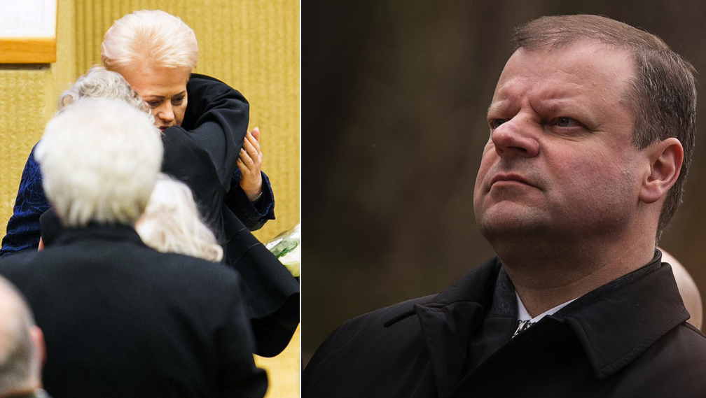 | Prezidento posto siekiantis premjeras S. Skvernelis (dešinėje) ir prezidentė D. Grybauskaitė (kairėjė) šnibždanti į ausį apie savo nežinojimą disidentei N. Sadūnaitei. |