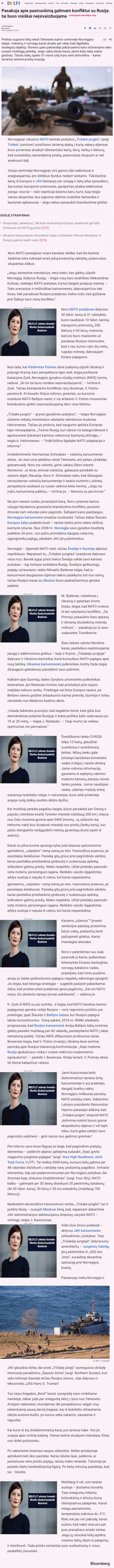 „Jeigu atmesime marsiečius, nėra nieko, kas galėtų užpulti Norvegiją, išskyrus Rusiją“, - cituojamas rusų karo analitikas Aleksandras Goltsas, stebėjęs NATO pratybas, kurios baigėsi praėjusį mėnesį.