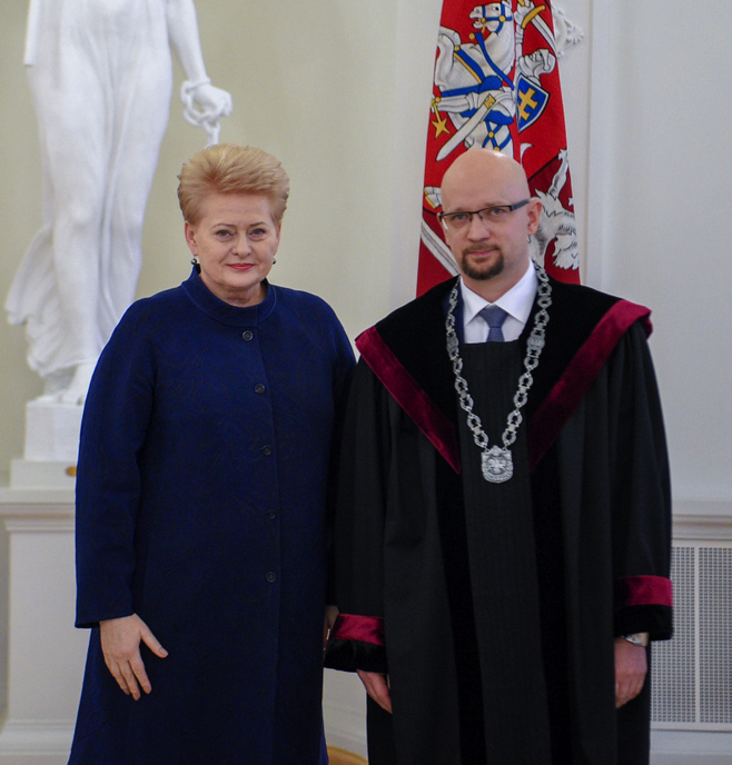 | Vilniaus miesto apylinkės teismo teisėjas, buvęs laikinasis Valstybės vaiko teisių apsaugos ir įvaikinimo tarnybos vadovas Janas Maciejevskis (dešinėje). Šių metų spalio 8 d. prezidentė priėmė teisėjo priesaiką. Nuotr. prezidentas.lt |