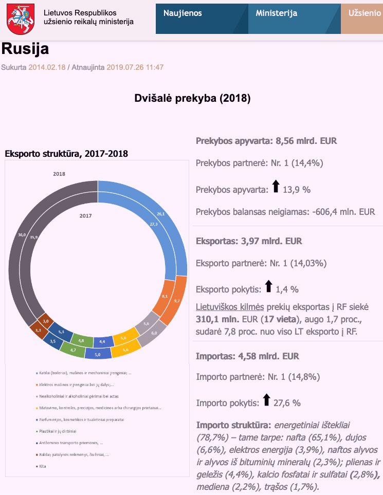 Todėl dar kartą atkreipiame dėmesį, jei jau negalite visur nekaišioti savo Rusijos, prekybos partnerės Lietuvai Nr. 1: panagrinėkite šia lentelę, pirmininke, jei jau be žodžių „Kremlius“ ir „Putinas“ nei dienos neišgyvenate (čia duomenys švieži, ką tik paskelbti LR Užsienio reikalų ministerijos tinklalapyje):