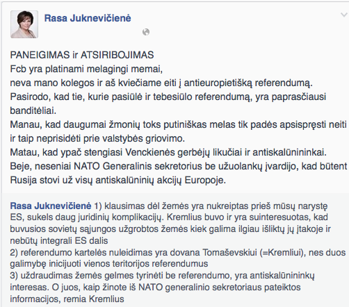 Konservatorė Rasa Juknevičienė savo asmeninėje facebook paskyroje platina tokio turinio pranešimus: